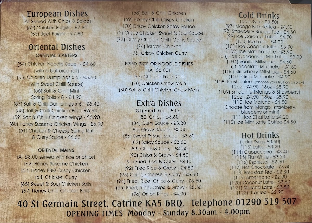 Don’t just take our word for it—customers have been singing its praises! Emma Reid raves about the honey sesame chicken with fried rice, claiming it to be the best she's ever tasted and leaving her eager to return. Confirming that the café is a hit among locals, F A speaks highly of the great food and good coffee, while Alex C highlights the speedy service, delicious breakfast options, and the friendliness of the staff. Rory S appreciates the café's dog-friendly policy, making it a great stop for cyclists and walkers with furry friends.